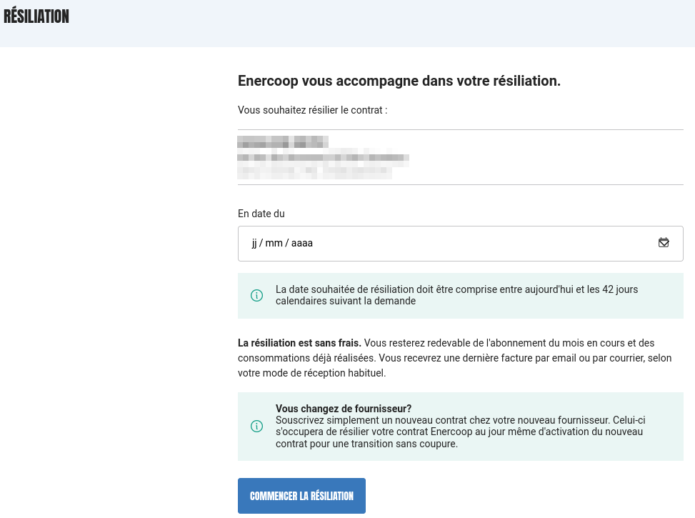 Dans un cas comme dans l'autre, vous recevrez simplement de la part d'Enercoop, une facture de clôture. Cette facture, qui ne comporte aucun frais de résiliation, inclura uniquement les détails de votre consommation et le montant de l'abonnement jusqu'à la date de résiliation de votre contrat.